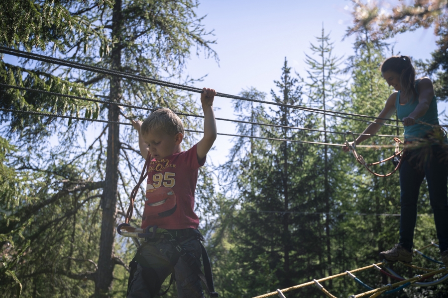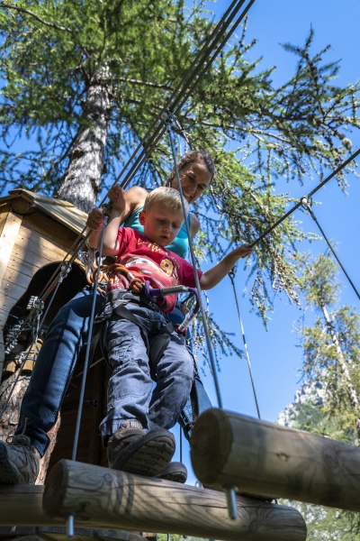 Evoluer d'arbre en arbre, en toute sécurité, sur des parcours de difficulté croissante. Un espace est dédié aux plus petits.
